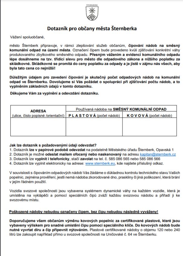 Důležitým údajem pro zavedení čipování je skutečný počet odpadových nádob na komunální odpad ve Šternberku. Dovolujeme si Vás požádat o spolupráci při zjišťování počtu nádob, a to vyplněním základních údajů v dotazníku, který najdete v příloze této zprávy a v papírové podobě jej dostanete do konce února letošního roku i do poštovní schránky.