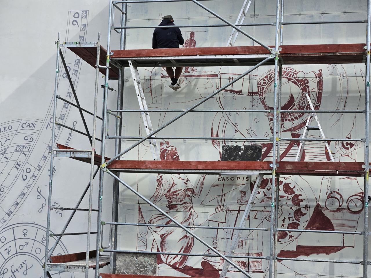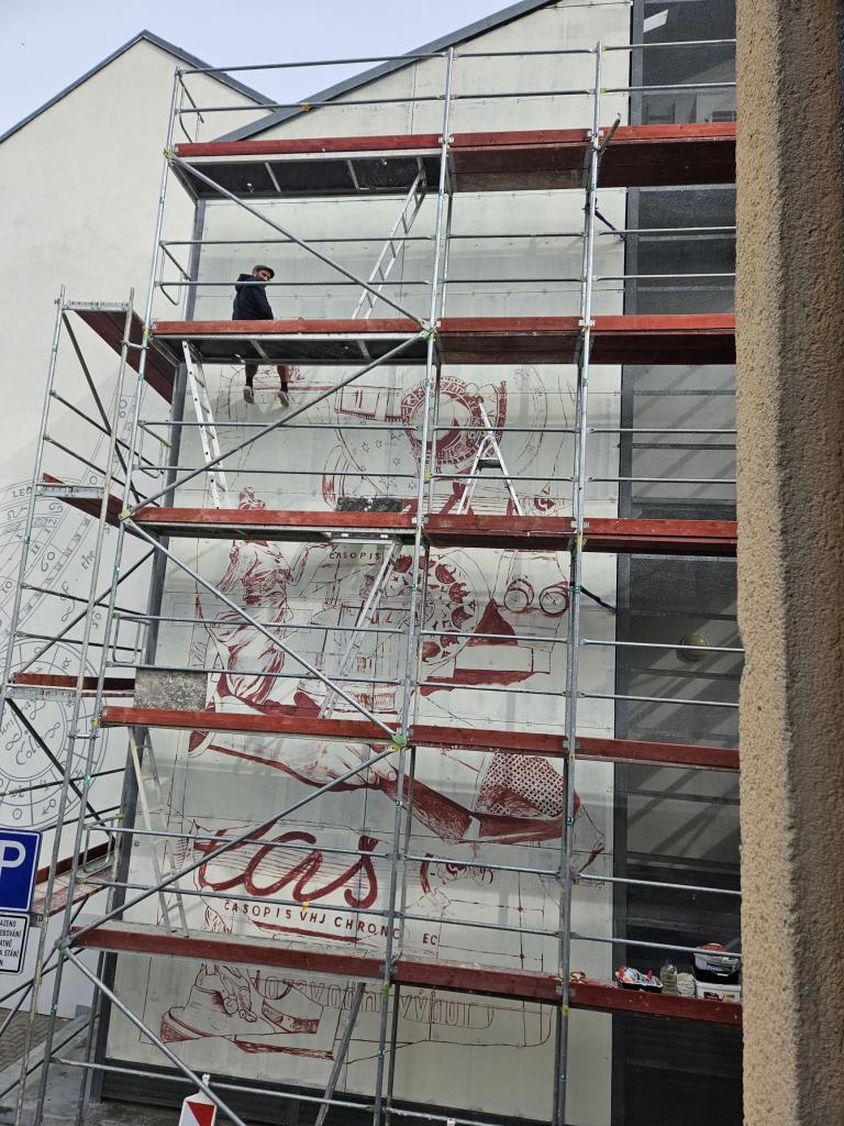 Dílo vzniká od pondělí 19. srpna, předpokládáme, že v první polovině září bude hotové. Malba bude evokovat hodinářskou historii Šternberka a lákat návštěvníky do Expozice času. Zároveň bude tematicky navazovat na malbu vytvořenou v roce 2023 na štítové zdi základní umělecké školy, která spojuje minulost, současnost i budoucnost města Šternberka, jsou zastoupeny významné osobnosti, události, milníky.