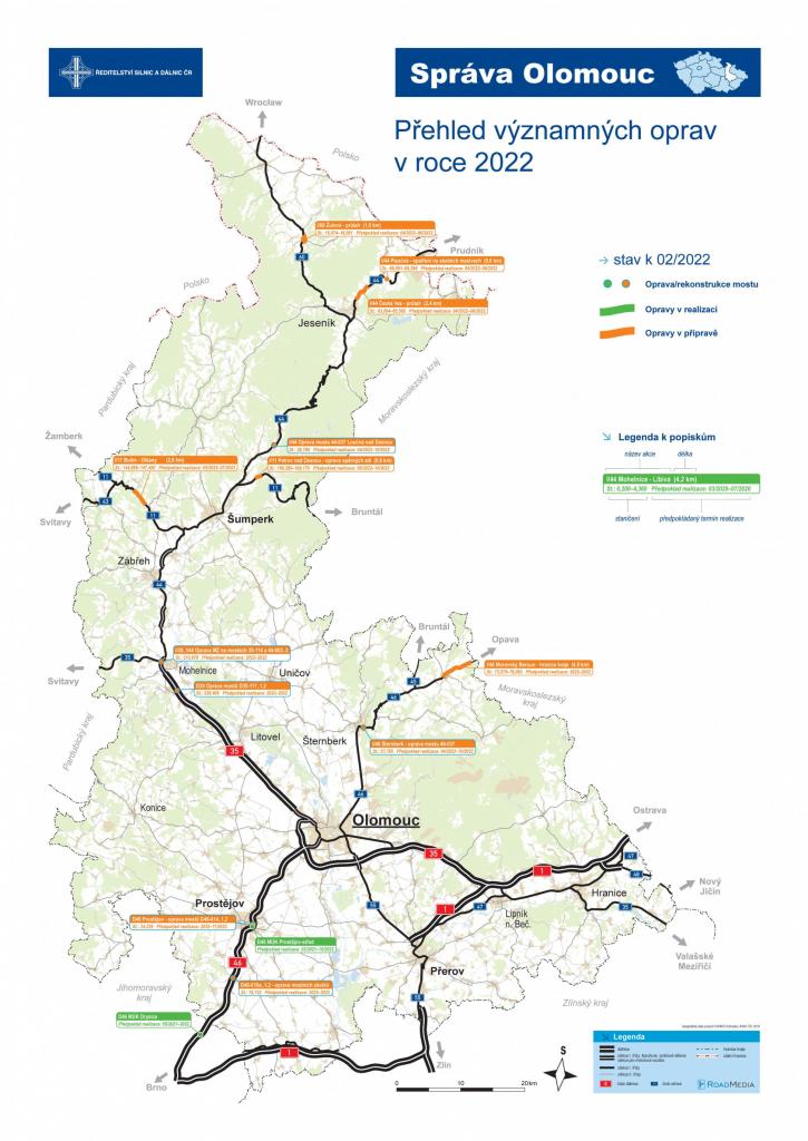 Konkrétní místa oprav jsou znázorněna v přiložené mapě, kde jsou k vidění probíhající akce (zeleně) a připravované projekty (oranžově). Podrobnosti k opravám nabízí Mapová aplikace na oficiálním webu https://www.rsd.cz/wps/portal/, novinky či upřesnění budou zveřejněny včas také na twitterovém účtu ŘSD ČR https://twitter.com/RSD_Olomoucky.