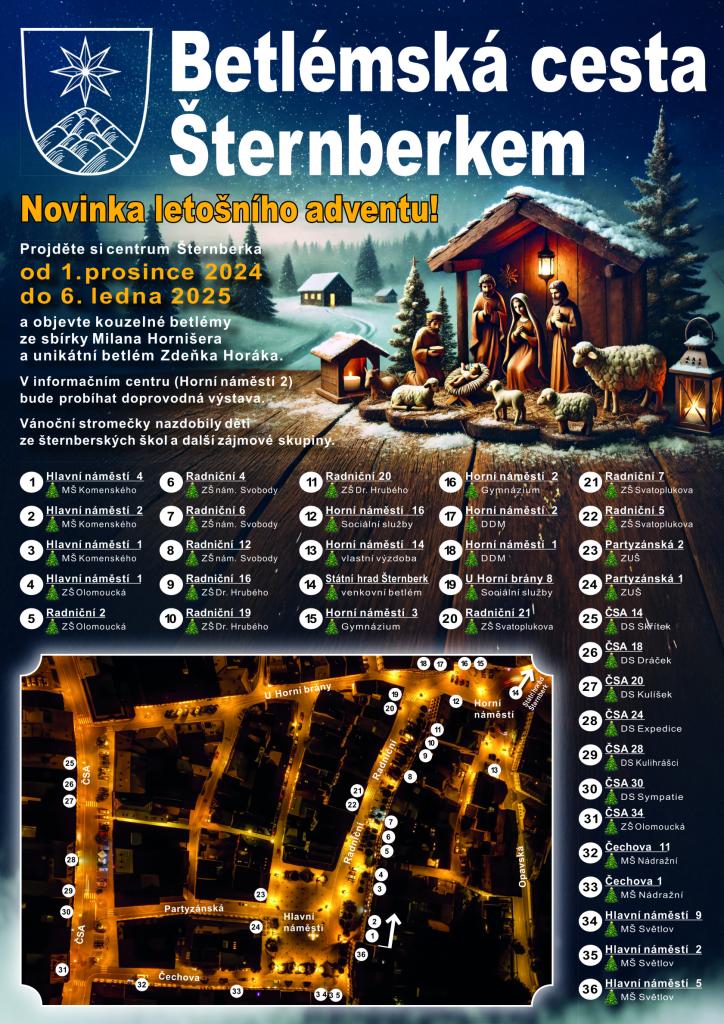 Cesta bude přístupná od neděle 1. prosince do pondělí 6. ledna 2025. Trasu betlémské cesty ozdobí vánoční stromečky v nádobách, které odekorují děti šternberských škol, seniorské kluby a další zájmové skupiny.