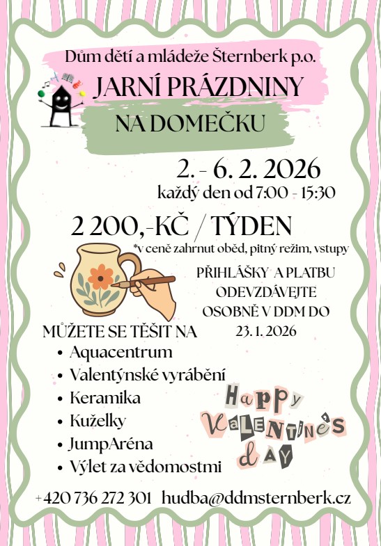 Jarní prázdniny v Domečku se konají od 2. do 6. února. Každý den čeká na děti jiná aktivita: v pondělí se půjde do Aquacentra Šternberk, v úterý bude vyrábění ze samotvrdnoucí hmoty, valentýnské tvoření pod vedením paní učitelky Páji Opavské a velká Šternberská etapovka.