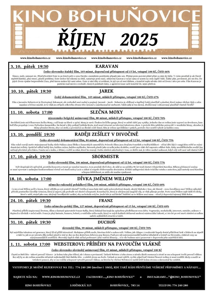 Přinášíme vám program Kina Bohuňovice na měsíc říjen 2025.