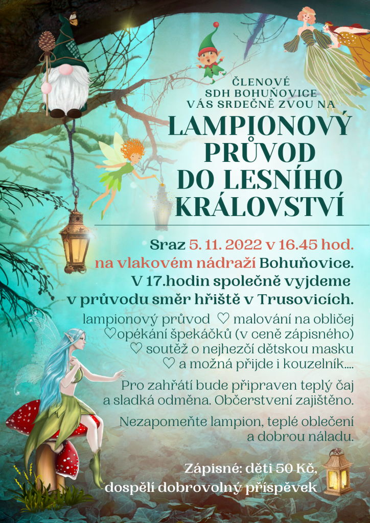 Členové SDH Bohuňovice Vás srdečně zvou na lampionový průvod, který započne v sobotu 5. listopadu v 16:45 hodin na vlakovém nádraží v Bohuňovicích. Zápisné pro děti stojí 50 Kč, dospělí mohou přispět dobrovolným příspěvkem.