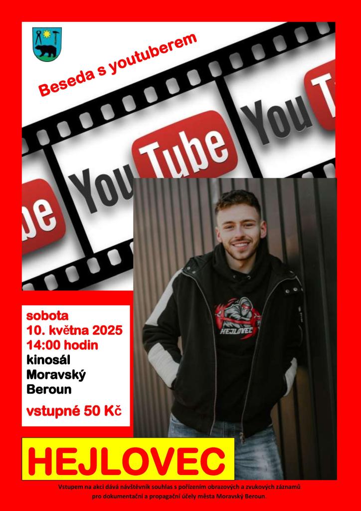 V sobotu 10. května se v kinosále v Moravském Berouně uskuteční beseda s youtuberem Hejlovcem. Vstupné je 50 korun, na akci zve město Moravský Beroun.