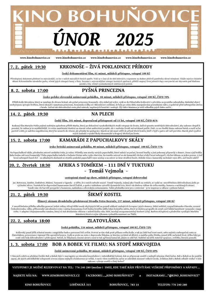 Přinášíme vám program kina Bohuňovice na únor 2025. Veškeré podrobnosti najdete na přiloženém plakátu.