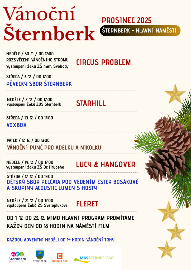 Tradiční vánoční program, stánkový prodej od 14 do 20 hodin. V 17 hodin vystoupení žáků ZŠ Dr. Hrubého, kapela LUCY & HANGOVER.