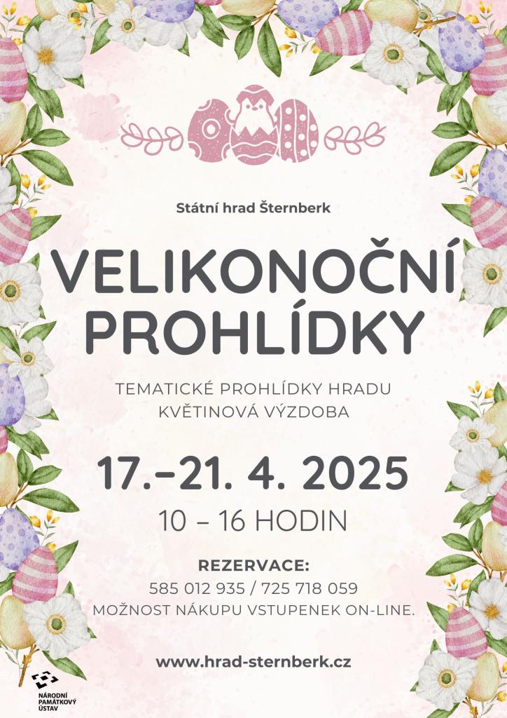 Velikonoční prohlídky hradu Šternberk plánujeme od čtvrtka 17. 4. do pondělí 21. 4. 2025 vždy od 10 do 16 hodin. Provázet budeme na obou návštěvnických okruzích. Výklad průvodců bude rozšířen a seznámí návštěvníky nejen s historií hradu Šternberk, ale rovněž s historií Velikonoc. Návštěvníci se dozvědí zajímavé informace týkající se nejvýznamnějších jarních svátků. V historických interiérech hradu bude instalovaná velikonoční výstava doplněná o květinovou výzdobu.