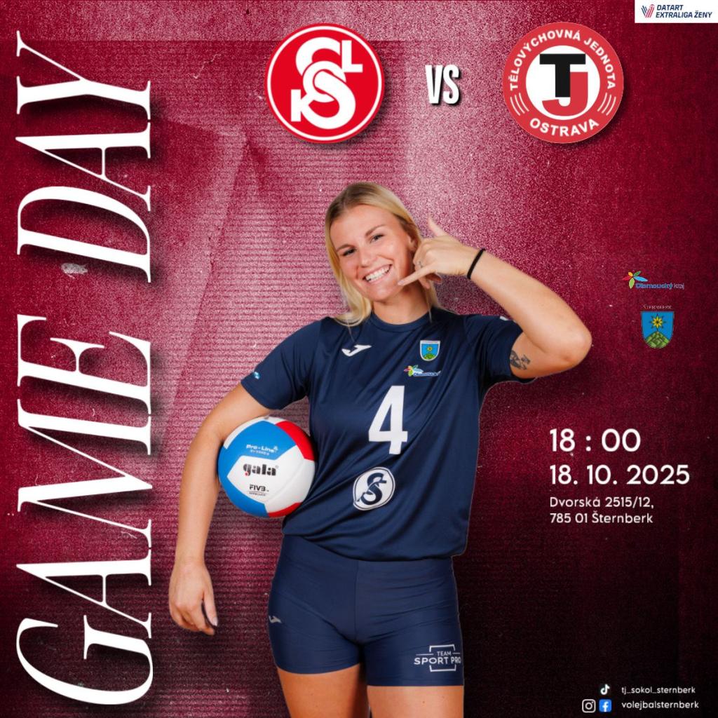Zveme diváky na první domácí zápas volejbalové extraligy žen. Utkání se koná v sobotu 18. 10. 2025 mezi Sokolem Šternberk a týmem TJ Ostrava. Zápas začíná v 18:00