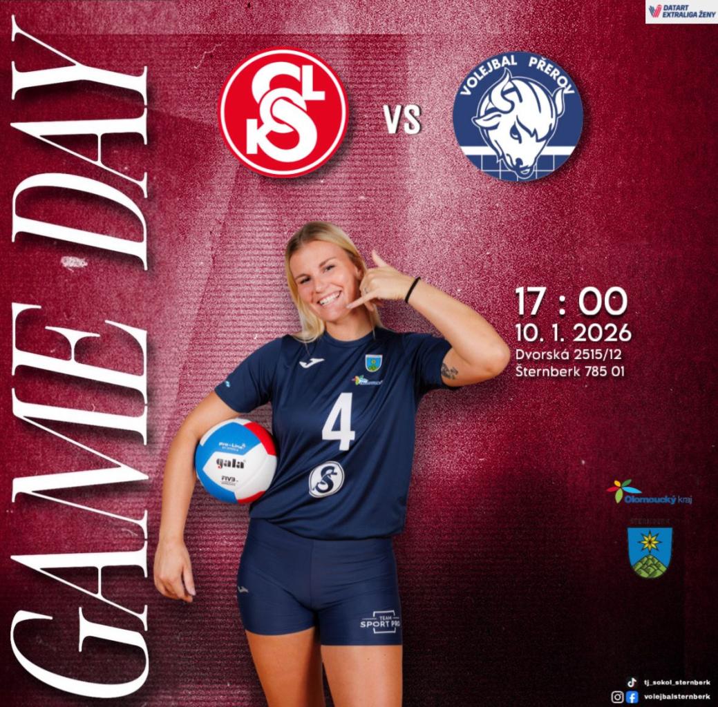 Zveme diváky na další domácí zápas volejbalové extraligy žen. Utkání se koná v sobotu 10. 1. 2026 mezi Sokolem Šternberk a týmem Volejbal Přerov. Zápas začíná v 17:00 v hale Ecce Homo na Dvorské ulici ve Šternberku. Přijďte povzbudit náš tým, potřebujeme vás jako 7. hráče!