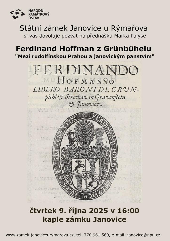 Ve čtvrtek 9. října 2025 se od 16:00 v kapli na zámku Janovice uskuteční přednáška studenta historie Marka Palyse na téma "Ferdinand Hofmann z Grünbühelu, mezi rudolfínskou Prahou a janovickým panstvím". Všichni jste srdečně zváni.