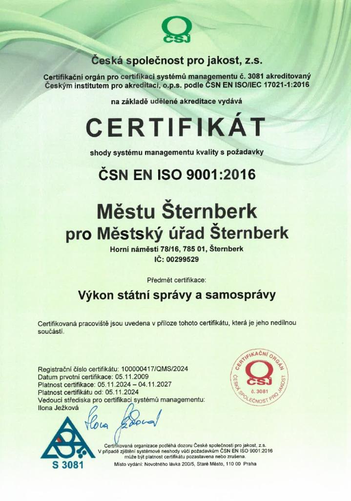 Certifikát shody systému managementu kvality s požadavky normy ČSN EN ISO 9001:2016 s platností do 04.11.2027